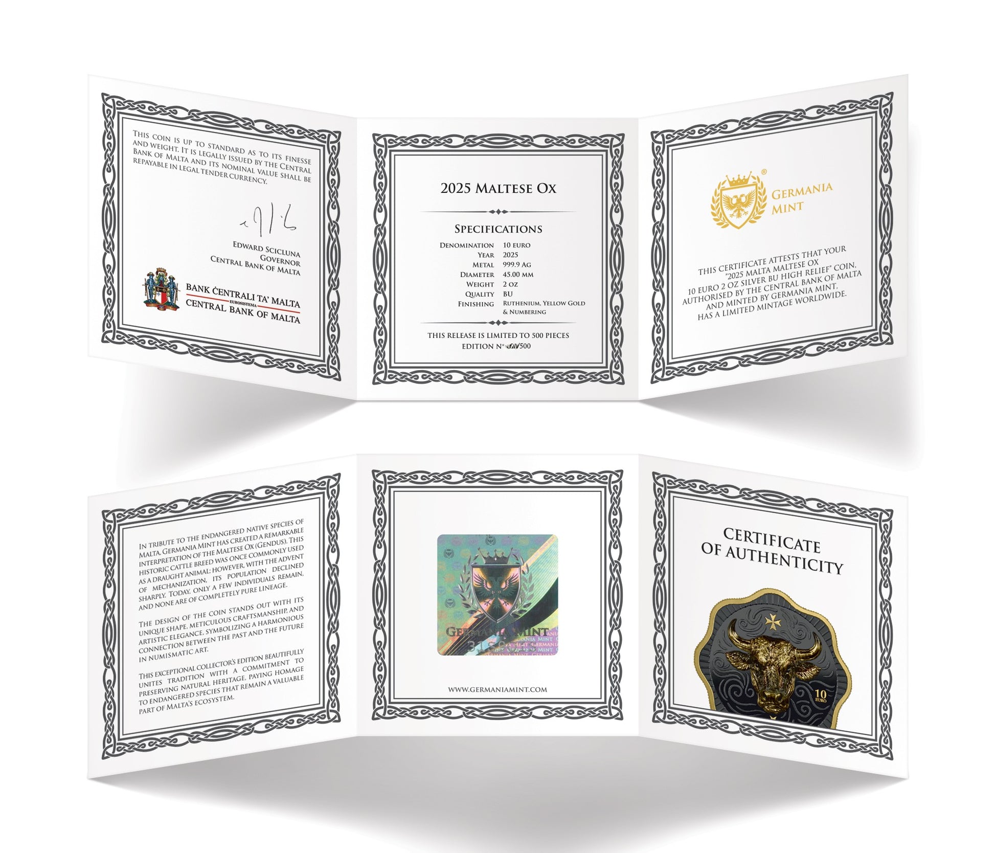 Malta Maltese - Ox - 10€ - Germania Mint 2 oz Silbermünze High Relief Ruthenium Gelbgold***
